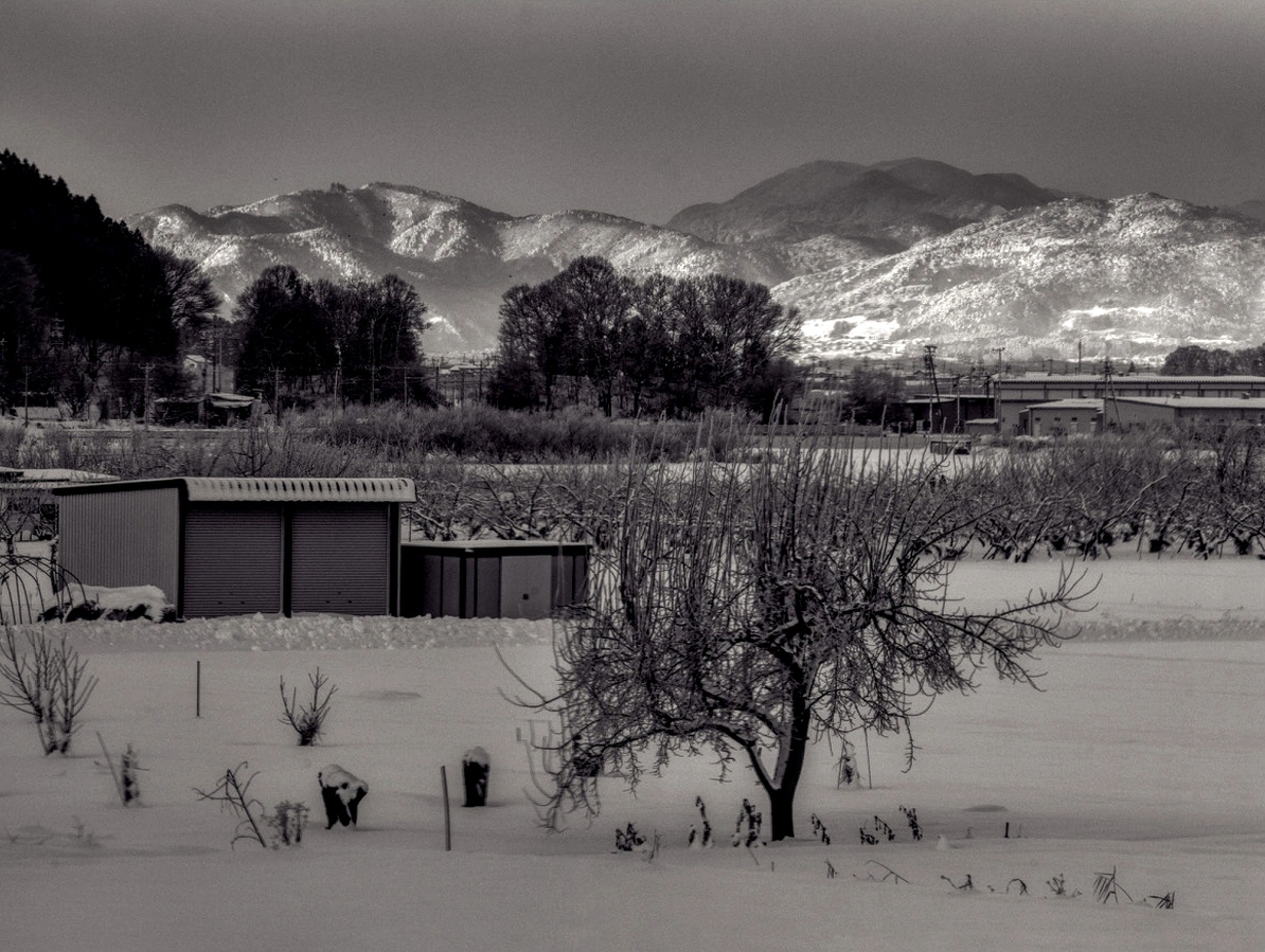 Part of a small limited edition Series I will steadily be releasing. This image was taken in the depth of winter during my first trip to see the snow monkeys of northern Japan. I traveled on a late night bus to ensure arrival in time to catch the first train which would ultimately time my arrival to the snow monkey park at just before the gate opens. However the same reason I chose this day to arrive, ultimately led to me arriving late. In fact the bus was the only bus which departed Shinjuku that evening heading north as all others were cancelled. Still it made the journey successfully. Arriving at Nagano station in the dark I had about 1 hour before the first train arrived. Snow was falling outside the station and temperatures were very low even north Japan standards, reminding me of the year I lived in Alaska in my youth. When the train arrived, it rolled in very very slowly, and was covered with Ice including a skirt of Icicles. It was beautiful and filled me with a deepened sense of my day ahead during the blizzard. Still dark locals who generally dress surprisingly light in Nagano were bundled up and many were clearly very cold as the trains heater seemed to be having problems, with any heat generating quickly escaping and being replaced with an arctic chill at each stop when the doors opened. I fortunately came very prepared as working on a mountain in the lower 48 and living in Alaska as a child taught me it's always better to be too warm rather than too cold. As the train moved on into the wind, snow, and slow hints of sunrise it began to slow little by little until reaching an outright crawl just as landscapes began to be visible to the naked eye, and then it stopped on the tracks for a very long time. It was during this time as the sun began to hit the mountains in the distance that I aimed my medium format camera at the emerging landscape. At times snow flurries made it impossible to get a clear image, but as if by destiny, there were beautiful moments of comparative calm, revealing the beauty in front of me. I was beginning to sense I may not arrive on time to the monkey park, if at all, but was so enchanted by this landscape that I would have been fine staying here all day and exploring it more intimately. However the train did begin to move again, in the opposite direction! It went to the last station where we directed to busses but ultimately re-directed to the train. Apparently there was severe ice on the tracks ahead which at the last moment was cleared. Ultimately I arrived at the park about 1 hour late, as the storm subsided. Of course I wanted to capture the snow monkeys during the blizzard, however I would not trade these landscape photos for the world. I am in fact planning a full day trip to this area this winter when the weather is similar.